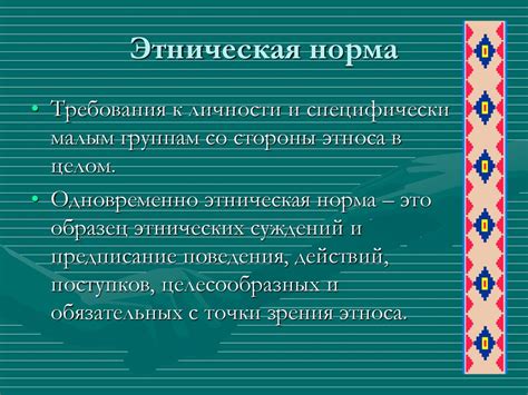 Этническая норма – это набор правил, ценностей и обычаев, которые существуют в рамках определенной этнической группы и регулируют поведение и взаимодействие ее членов.