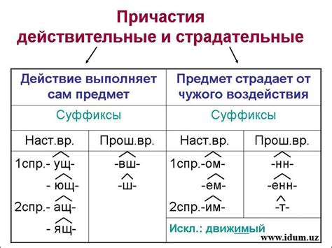 Причастия являются одной из важных частей речи в русском языке. Они образуются от глаголов и могут выполнять функции как глагола, так и прилагательного.