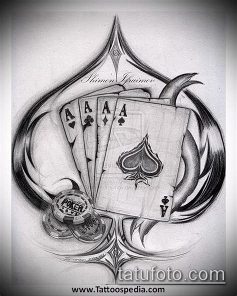 Татуировка с изображением четырех тузов также может быть связана с азартными играми и карточными мотивами. Она может быть символом удачи и победы, а также отражать стремление к риску и желание выиграть. Этот дизайн может привлекать любителей карточных игр и людей, которые ценят волнение и азарт.